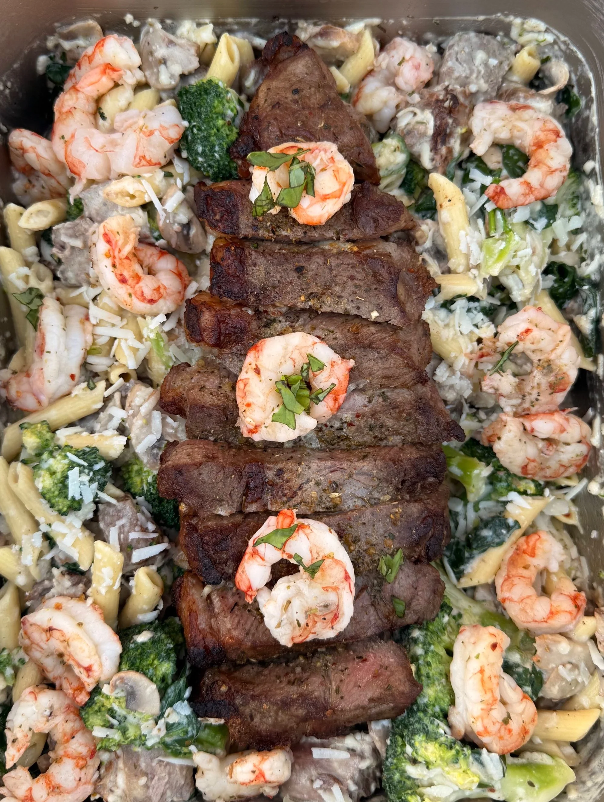 Tender ribeye steak and juicy shrimp tossed in a rich, creamy Alfredo sauce, served alongside a medley of fresh sautéed vegetables.